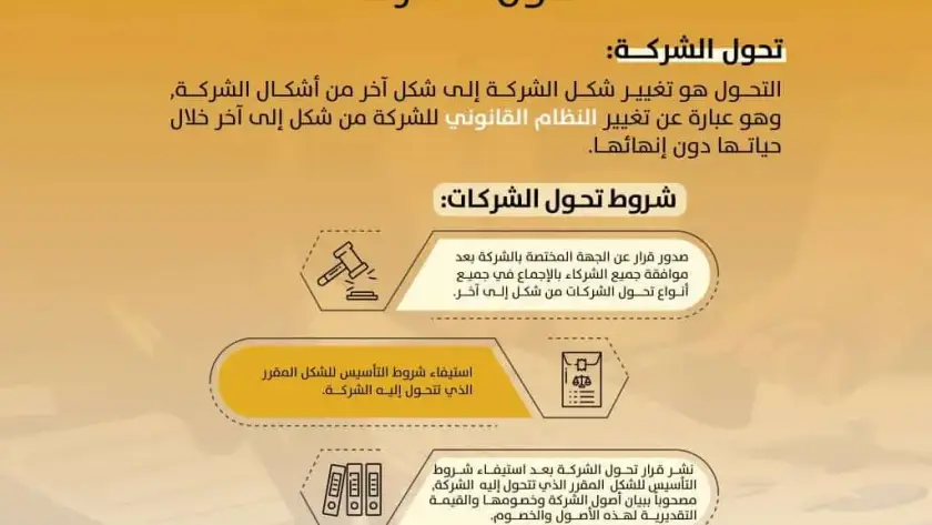 يكون تحول الشركة بقرار يصدر طبقا للأوضاع المقررة لتعديل عقد الشركة القائمة أو نظامها الأساسي، وإتمام إجراءات التأسيس والشروط المقررة للشكل الذي تحولت إليه الشركة